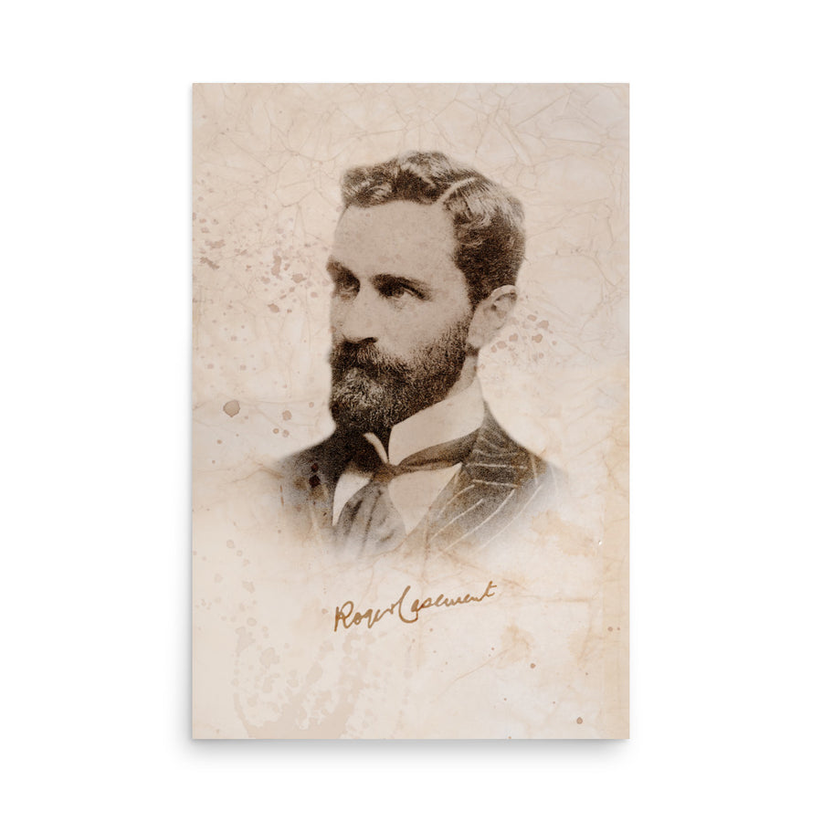 A vintage style homage to Roger David Casement. Born into an Anglo-Irish family in Sandycove, Dublin in 1864, Roger Casement was an Irish nationalist and human rights activist. Known for exposing human rights abuses in the Congo and Peru, he received a knighthood for his service as a British consul. However, his support for Irish independence led to his arrest and trial for treason in 1916. Casement's legacy is complex, celebrated as a humanitarian and condemned as a traitor by some. His execution by hanging marked a pivotal moment in Irish history during the Easter Rising.