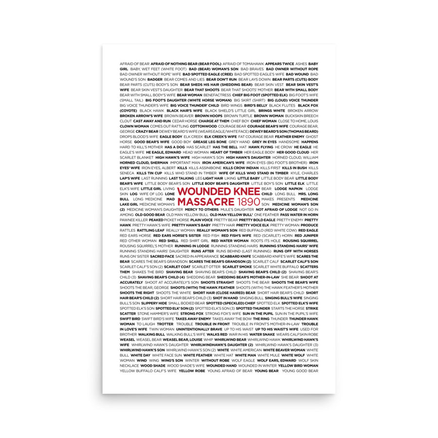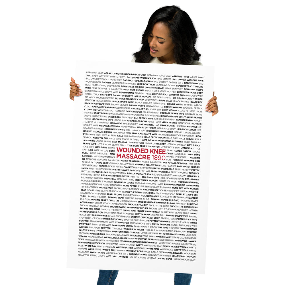 The Wounded Knee Massacre occurred on December 29, 1890, near Wounded Knee Creek on the Lakota Pine Ridge Indian Reservation in South Dakota. The poster print high-lights those killed on that day of infamy in 1890. U.S. troops opened fire on a group of unarmed Native Americans, including women and children. The massacre highlighted the harsh treatment of indigenous peoples during the westward expansion, leaving a lasting scar on Native American history.