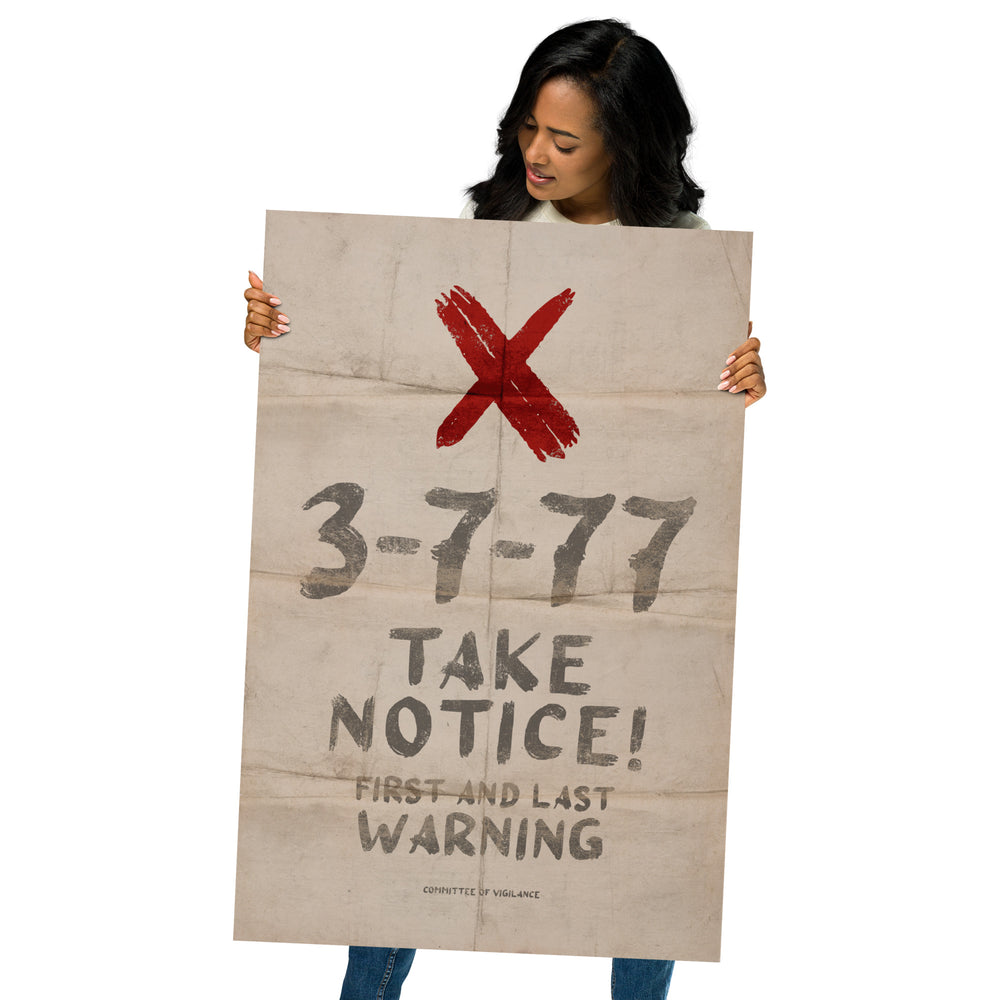 A poster design inspired by the infamous 3-7-77 symbol of the Montana Vigilantes. The Montana Vigilantes were a secret, extra-legal group formed in the 1860s to combat lawlessness during the gold rush era. One of their most notorious acts was the execution of outlaw Henry Plummer and his associates on January 10, 1864, using the symbol "3-7-77" as a warning. Many historians believe the numbers represented the dimensions of a grave: 3 feet long, 7 feet deep, and 7 feet wide. While controversial, the Vigilantes' actions sought to restore order and justice to the Montana Territory during a tumultuous period.